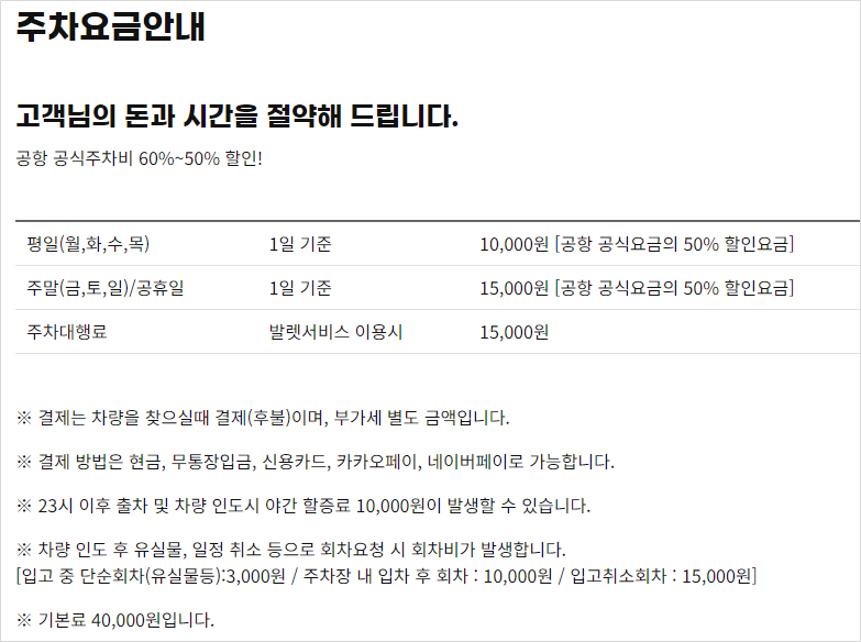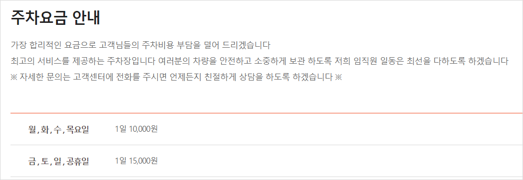 - 저렴한 가격: 평일 주차비 10,000원, 주말 주차비 15,000원
